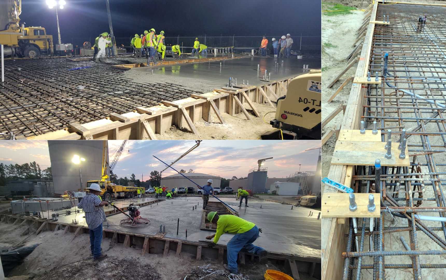 In August, the filter building’s foundation slab was prepared for concrete and then poured. Preparations included installing anchor bolts in the foundation piers, placing floor drains, embedding conduits within the foundation mattress, and installing smooth dowels along planned construction joints.